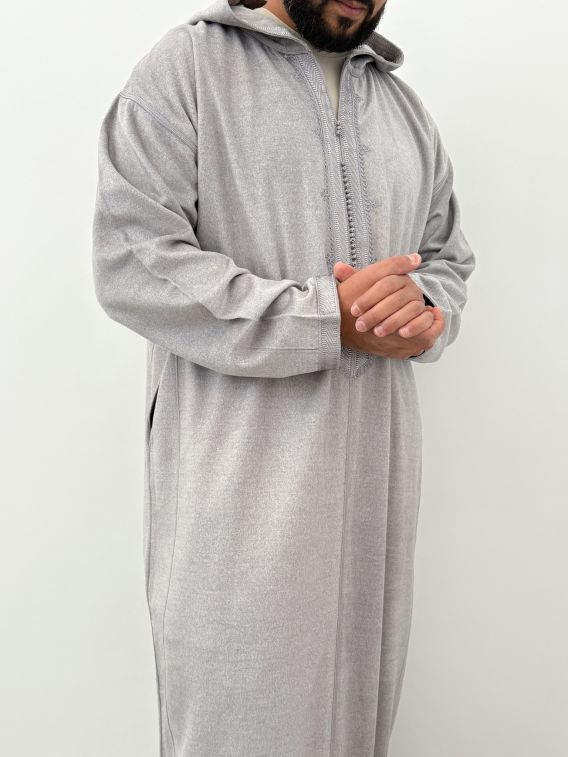 The djellaba homme is a long, loose-fitting robe with a pointed hood (called a kob), often made from wool or cotton depending on the season. Traditionally, it was designed to protect men from Morocco’s diverse climate — from the cold winds of the Atlas Mountains to the warm sun of the Sahara.