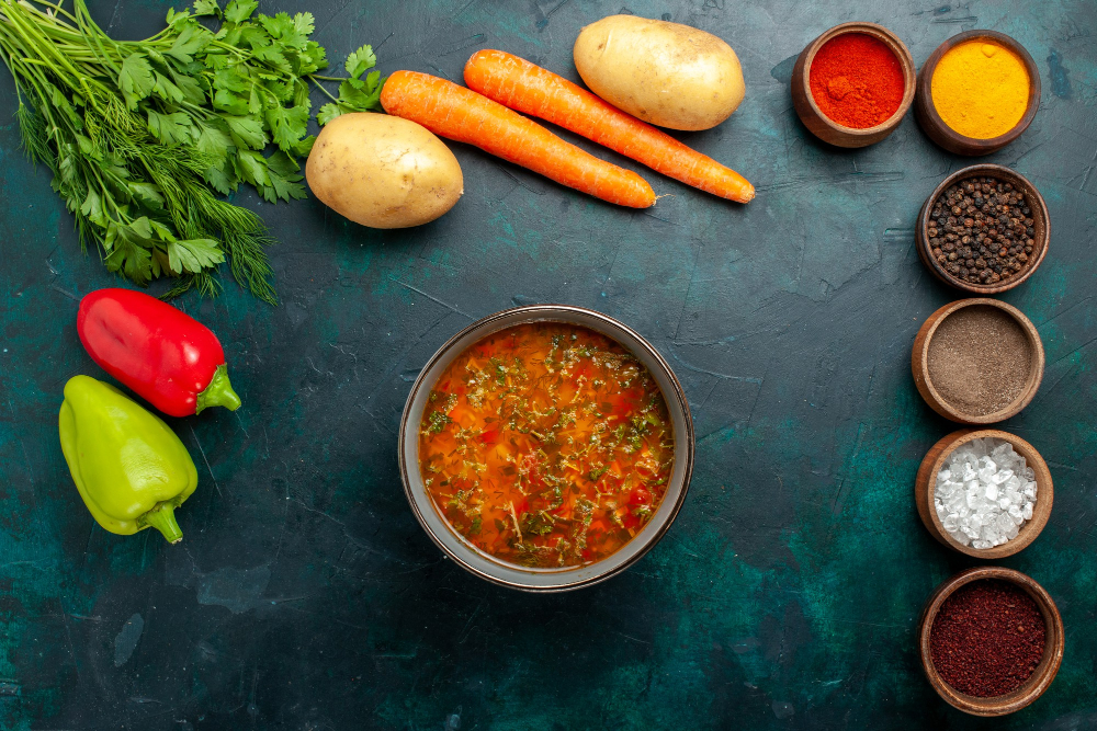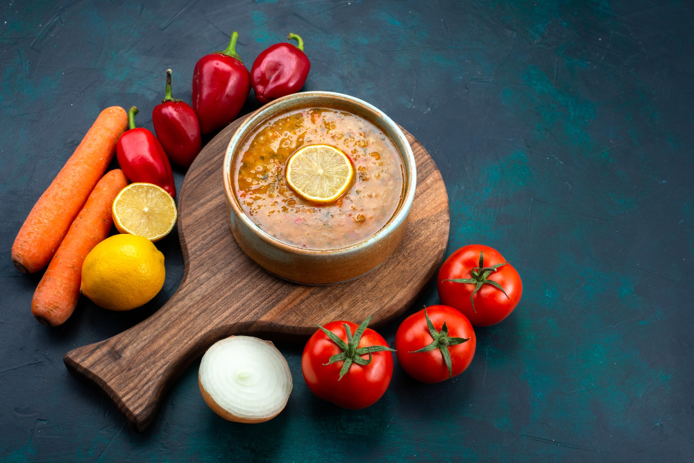 It’s usually made from a blend of fresh vegetables like carrots, zucchini, potatoes, onions, and tomatoes, seasoned with cumin, turmeric, and coriander, then pureed for a smooth texture.