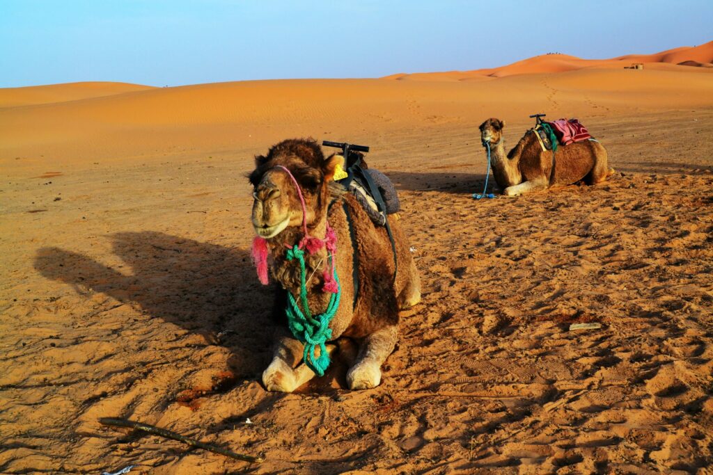 No trip to Morocco is complete without a camel trek. These iconic animals, technically dromedaries (one-humped camels), have been used for centuries as “ships of the desert.” Riding across the dunes of Merzouga or Zagora is both a cultural and wildlife experience.